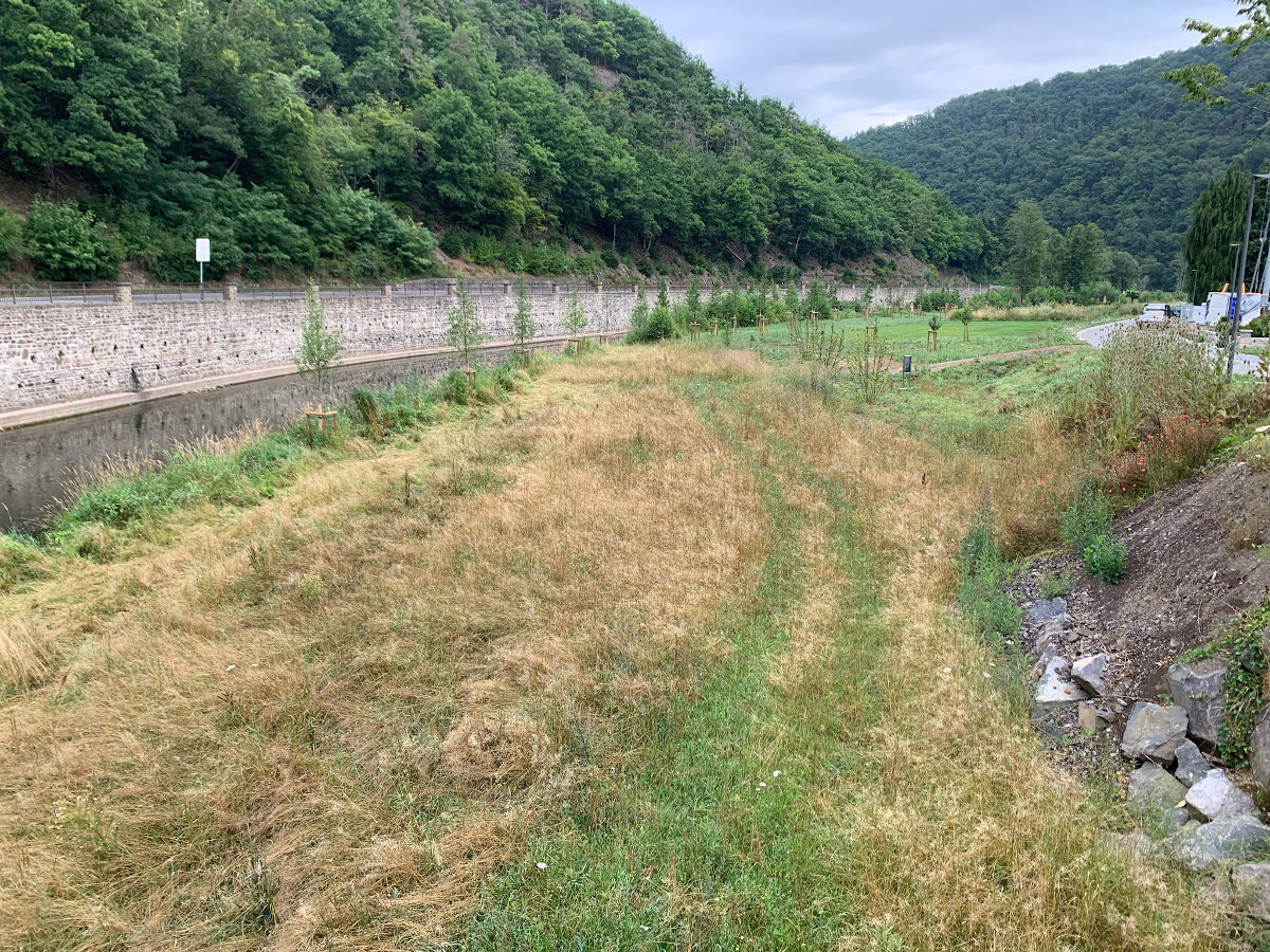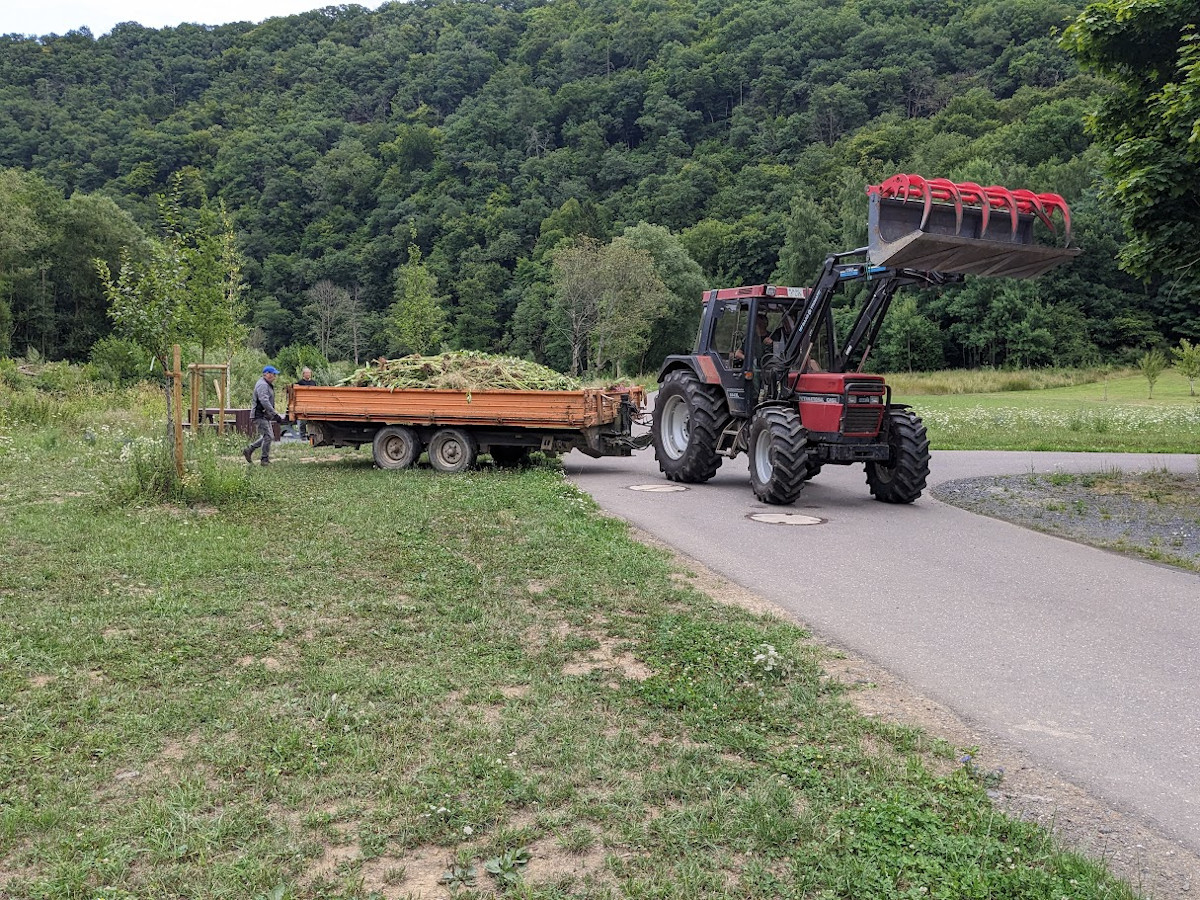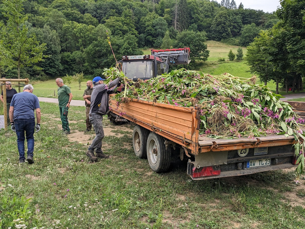 Zu den Teilnehmern zählten neben Mitarbeitenden des Landesforstbetriebes auch ortsansässige Jäger sowie engagierte Mitglieder der Gemeinde. Besonders gefreut hat uns die Teilnahme einer Schulklasse des Geografie-Leistungskurses aus Bayern, die sich im Rahmen einer Exkursion zum Thema Hochwasser im Ahrtal aufhielt. In etwa zwei Stunden gemeinsamer Arbeit konnten die Helfer mehrere Anhängerladungen der unerwünschten Pflanzen aus der Uferböschung entfernen. Die beseitigten Pflanzen wurden im Anschluss durch Gemeindemitglieder mithilfe unseres ansässigen Landwirts Wolfgang Justen und dessen Maschinen, zur späteren fachgerechten Entsorgung in der Mülldeponie Leimbach, weggefahren.
